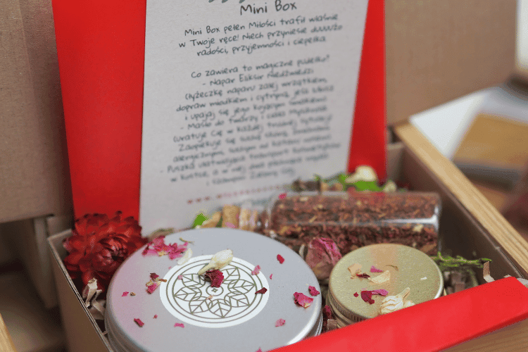 Przed Tobą Mini Box – pudełeczko z miniaturami naszych produktów. Od czasu do czasu staramy się wypuścić w świat limitowaną ilość takich pudełek, by mogły trafić do Swoich Ludzi i oczarować ich naturalnością, zapachem i miłością wypływającą z kartonika. Ta partia powstała z myślą o ukochaniu swojego ciała lub podzielenia się miłością z bliskimi z okazji nadchodzących Walentynek. Co więcęj, box okazał się być idealnym prezentem dla wyjeżdżających na ferie – zawiera wszystko, czego potrzeba w podróży – szampon, mydełka w puszce ułatwiającej transport, ratunkowe masło do ciała i sporą porcję najpyszniejszej, rozgrzewającej herbatki!
