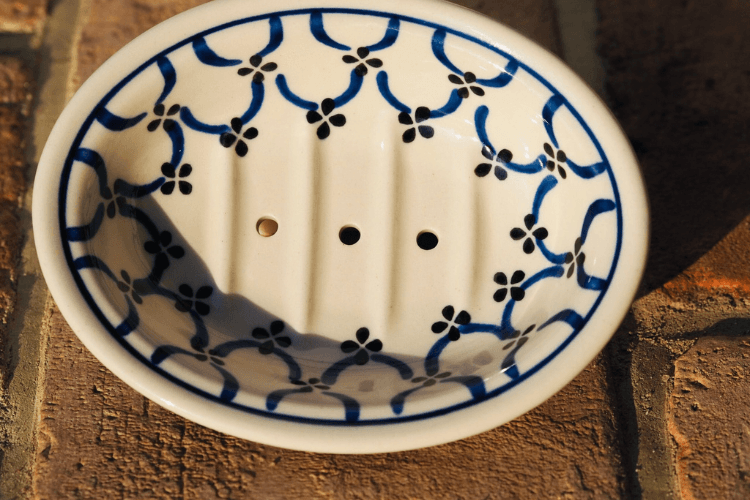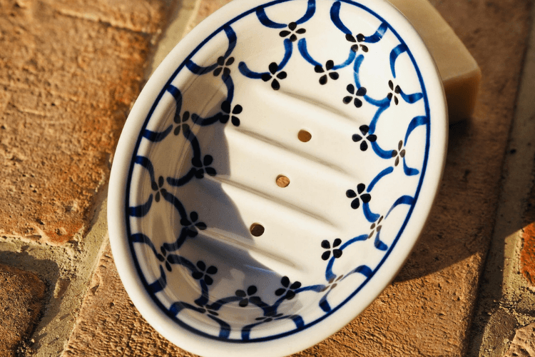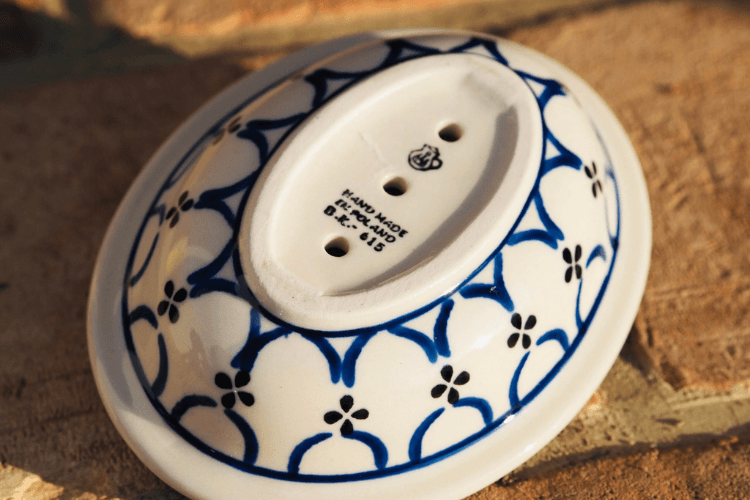 Mydelnica wykonana ręcznie w zakładach ceramiki w Bolesławcu. Idealnie nadaje się do naszych mydełek. Dzięki otworkom i żebrowaniu na dnie naczynia nadmiar wody zostaje odprowadzony, a mydło pozostaje suche. Wzory tworzone w bolesławieckich fabrykach to ponadczasowa, uniwersalna stylistyka, która pasuje do większości wnętrz.