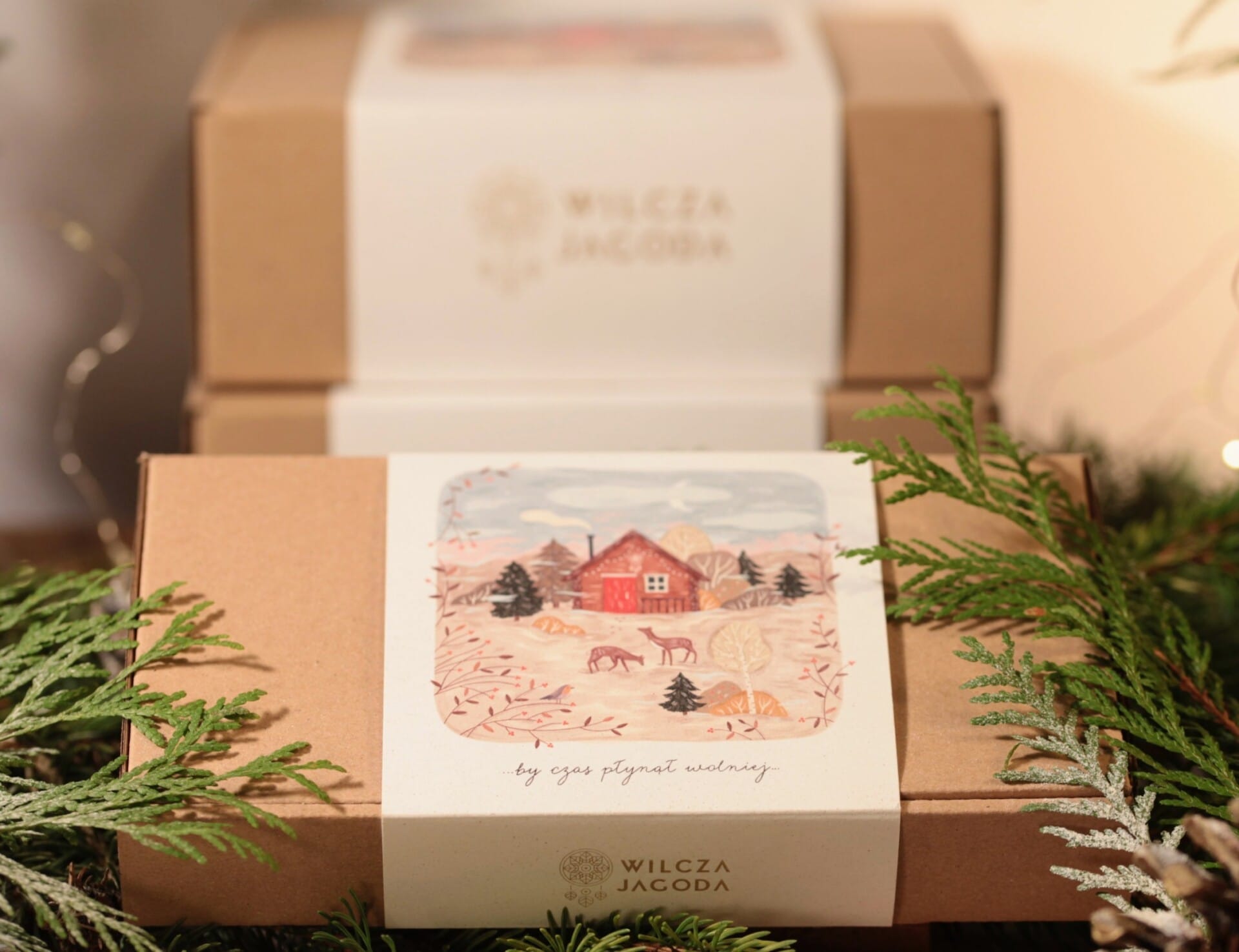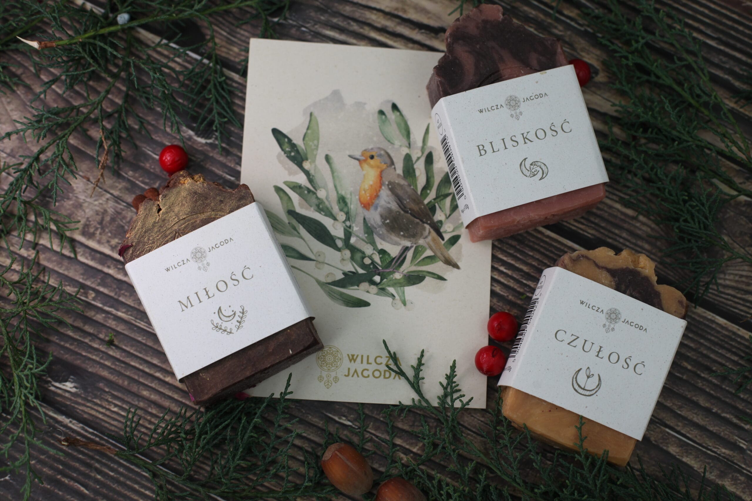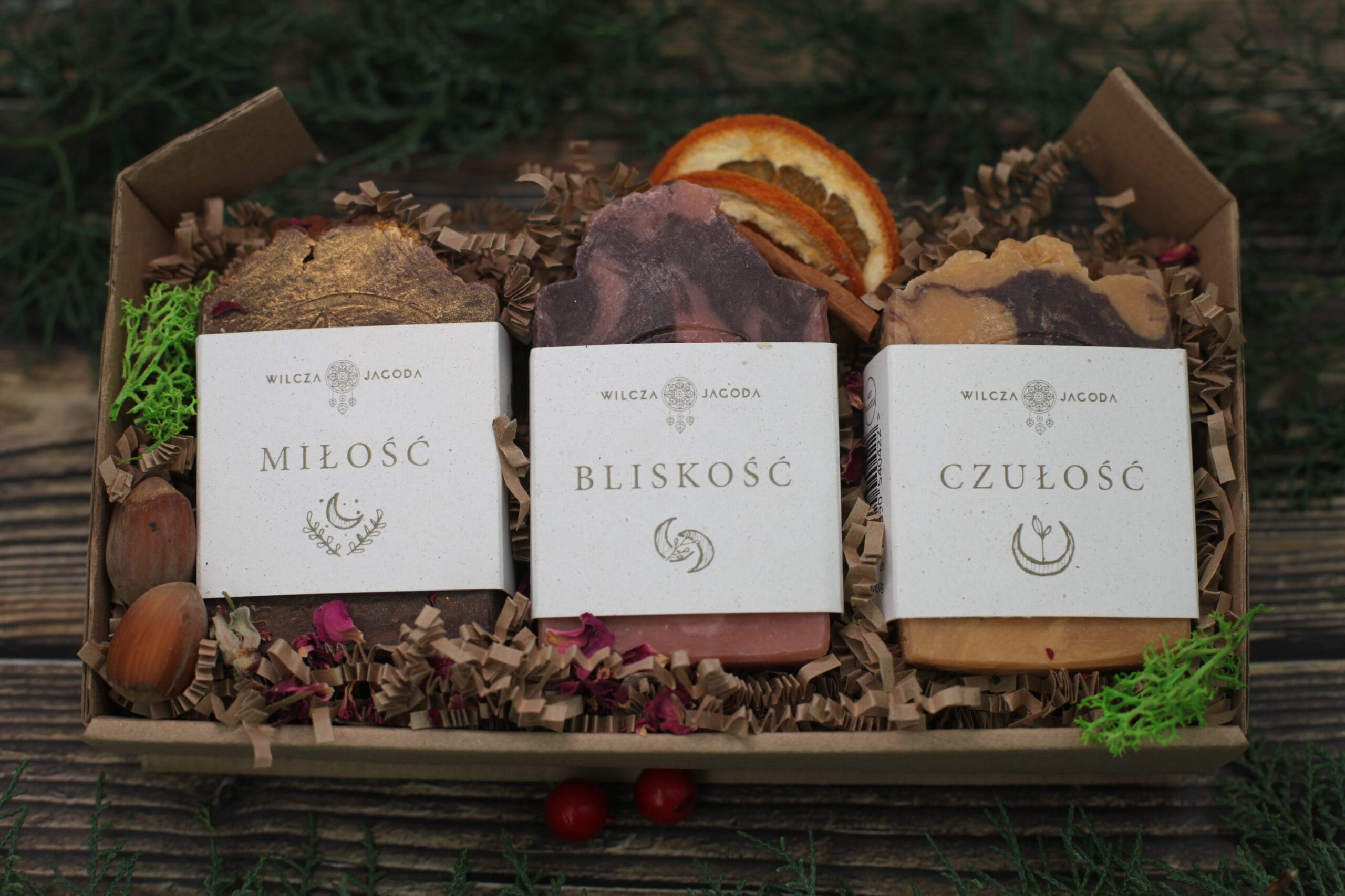 Trzy mydła ułożone na naturalnych wiórkach papierowych w towarzystwie suszonych roślin, zamknięte w papierowym pudełku ozdobionym banderolą, na której nadrukowaliśmy piękną ilustrację wykonaną przez Rysulkę specjalnie na wilcze zamówienie.