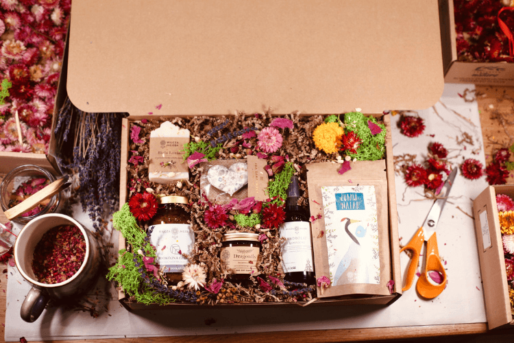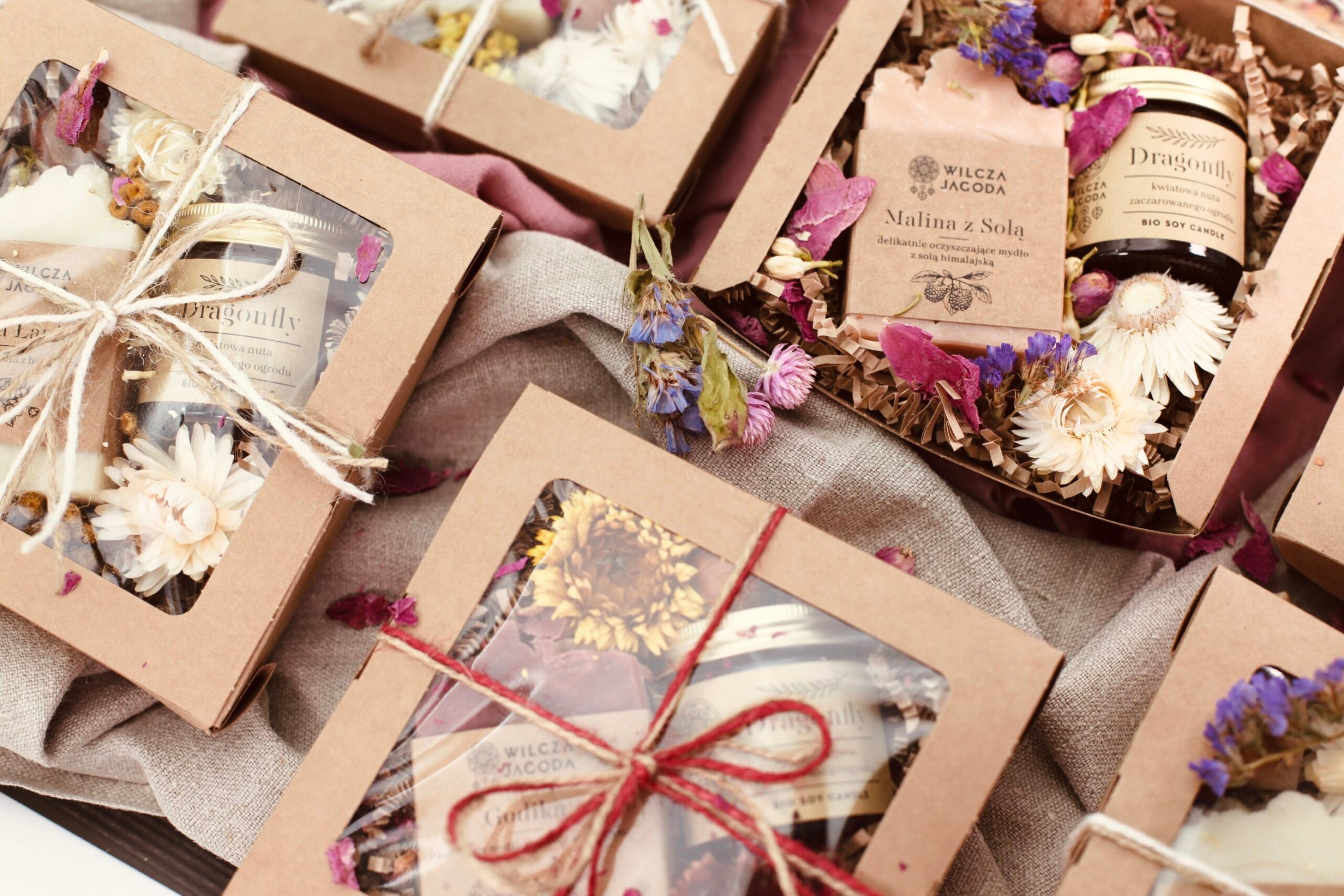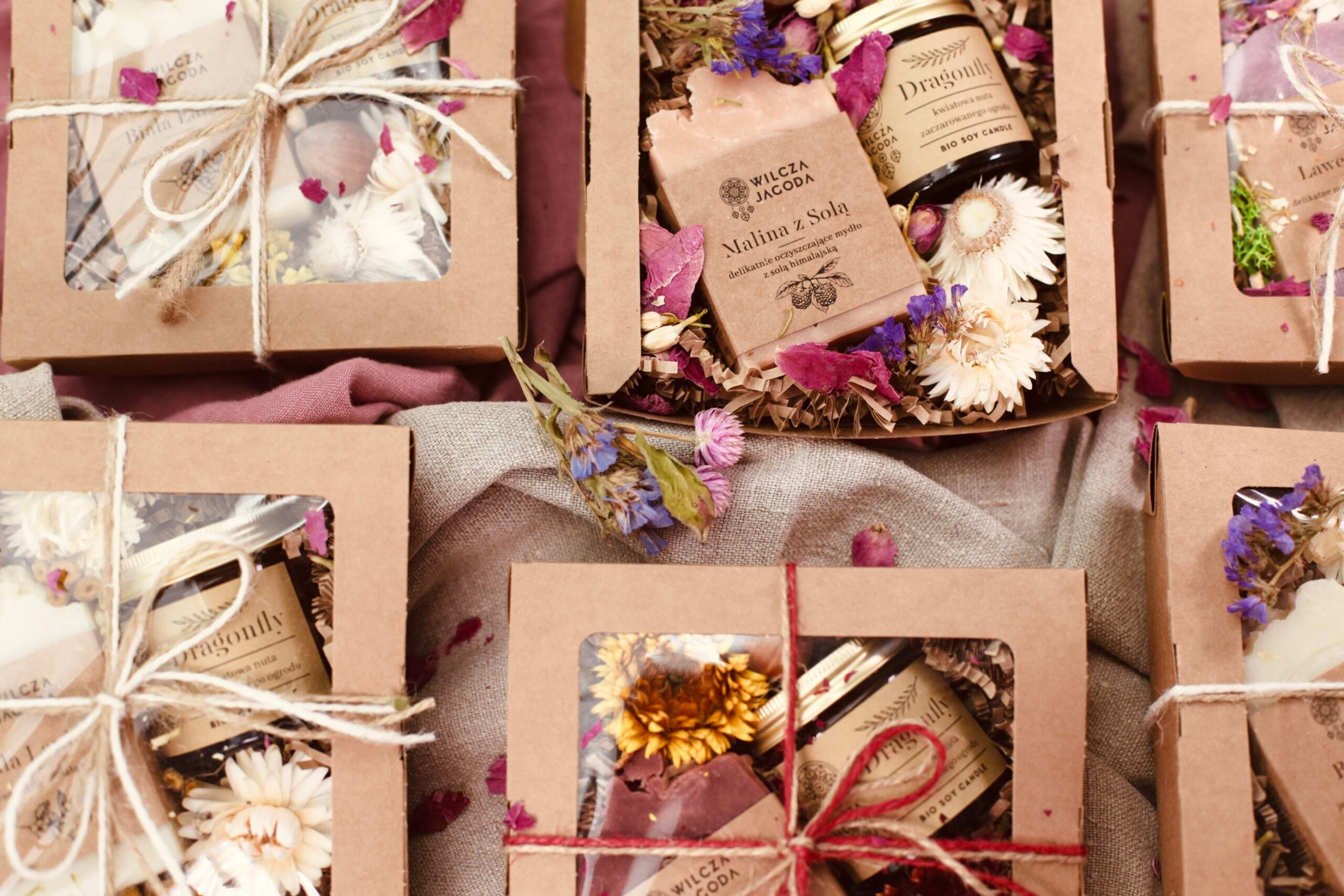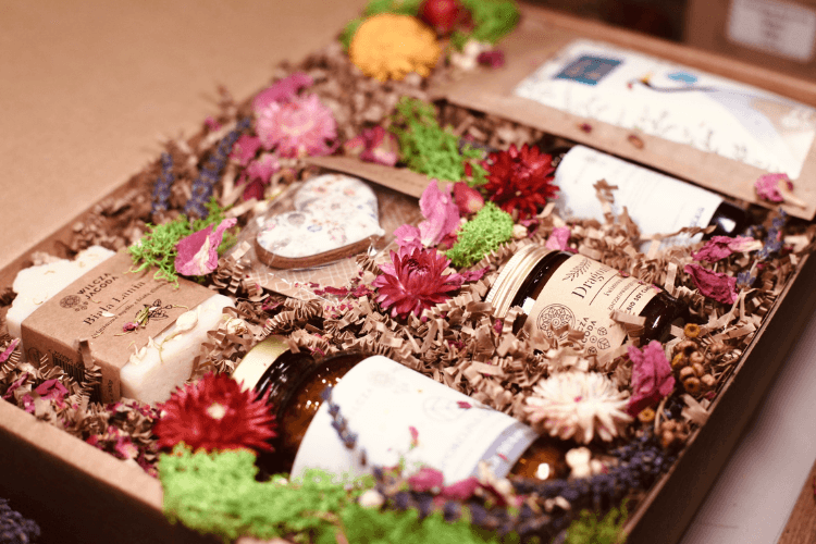 Zestaw widoczny na zdjęciach jest odpowiedzią na potrzebę obdarowania pracujących w firmie pań upominkami z okazji Dnia Kobiet. Zestaw jest różnorodny, obfity, a jednocześnie lekki, wiosenny, w kobiecej kolorystyce. Opakowanie wykonano z naturalnego papieru, podobnie jak wypełnienie, na którym zostały ułożone produkty. Całość udekorowaliśmy suszonymi roślinami – mchem, płatkami i łebkami kwiatów takich jak lawenda, piwonia, róża, kocanka. Do zestawu zostały dołączone pocztówki w pasującej stylistyce, a całość obwiązana elegancką, różową wstążką.
