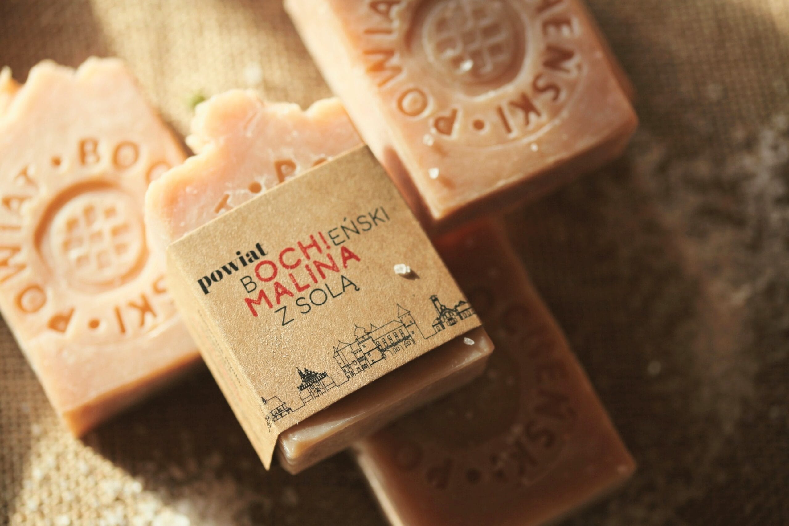 Dla Powiatu Bocheńskiego stworzyliśmy personalizowaną wersję naszego malinowego mydła z solą, które otrzymało nową szatę graficzną opakowania oraz piękną, „bocheńską” pieczęć na froncie.