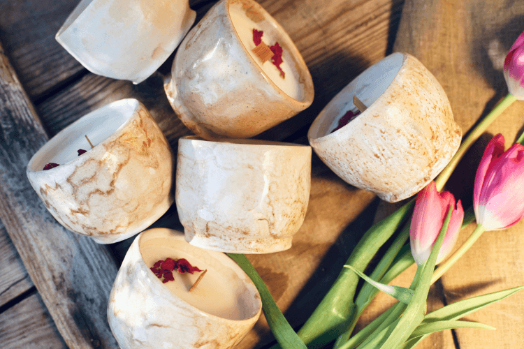 Do Twojego zamówienia trafi jedna z czarek widocznych na zdjęciu, którą w naszej pracowni wypełniliśmy świecą sojową z drewnianym knotem, lekko skwierczącym podczas palenia. Olejki dodane do wosku koją i wyciszają.