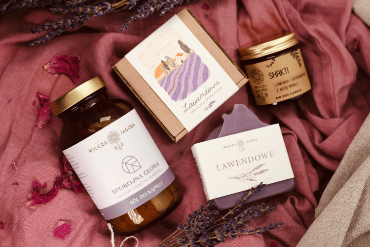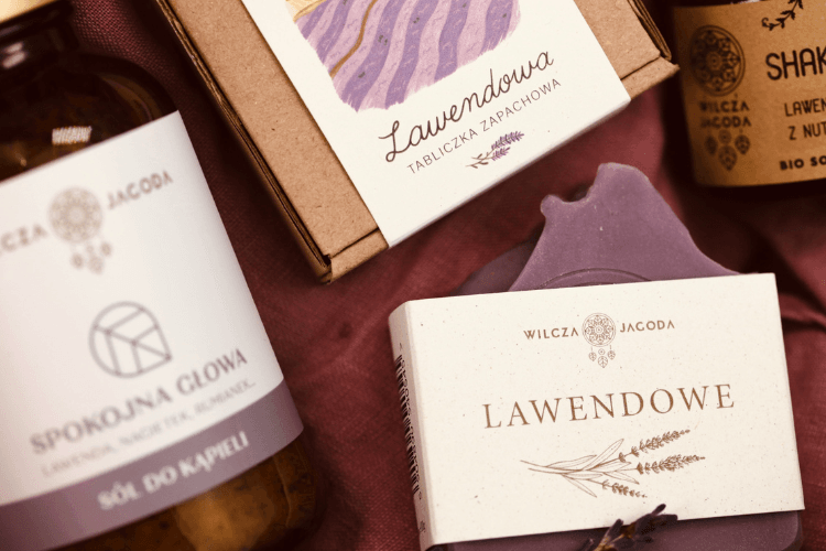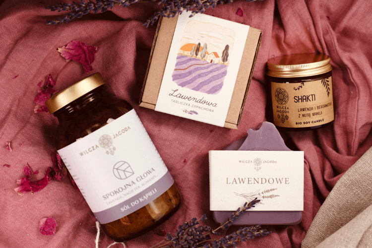 Całość wykończona jest ekologiczną obwolutą z papieru recyklingowego, na którym umieściliśmy autorską grafikę wykonaną przez Urszulę Grzesiek i podpisaną „Zestaw Pachnący Lawendą”.